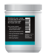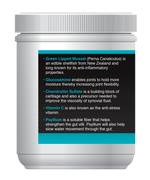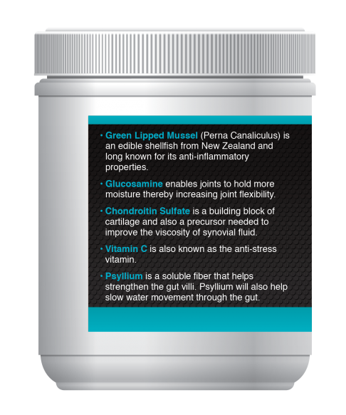 Psyllium Husk, Green Lipped Mussel (Freeze Dried), Glucosamine HCL, Chondroitin Sulfate (Shark), Vitamin C.
