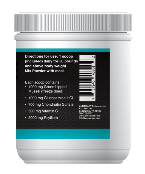 1 scoop (included) daily for >50 lbs. body weight. One serving is equal to 2 teaspoons or 10 cc’s. Mix powder with food.