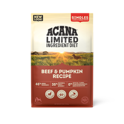 Our ACANA® food for dogs always goes beyond the 1st ingredient™, with thoughtfully crafted recipes from start to finish. Our ACANA Singles Limited Ingredient Diet Beef & Pumpkin Recipe is now loaded with more beef, fewer legumes and no peas for enhanced nutrition and taste your dog will love! Our enhanced recipe** includes 65%* quality ingredients from a single animal source and is complemented with richly nourishing whole pumpkin. Complete nutrition for choosy dogs or healthy dogs with food sensitivities.
