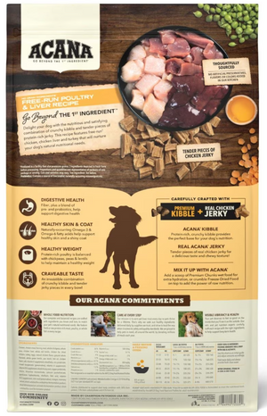 Satisfy all your bestie’s meatiest cravings with ACANA Butcher's Favorites Dry Dog Food, Free-Run Poultry & Liver Recipe. Simply bursting with quality nutrition, this meaty formula features high-quality ACANA freeze-dried kibble mixed with tender pieces of protein-rich real chicken jerky. A balanced blend of fresh or raw free-run chicken, chicken liver and turkey, plus chickpeas, peas and lentils provide grr-eat nutrition and help your pup maintain a healthy weight. Nutritious ingredients in the formula help support healthy digestion and skin and coat health, too. With up to 70% animal ingredients and 30% plant ingredients and nutrients, it’s a balanced formula full of what your furry friend needs to thrive!