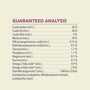 Metabolizable Energy is 3850 kcal/kg (439 kcal per 8 oz. cup), with 37 % from protein, 23 % from carbohydrates, and 40 % from fat.