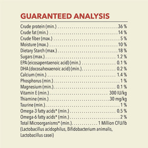 Metabolizable Energy is 3630 kcal/kg (414 kcal per 8 oz. cup), with 39 % from protein, 29 % from carbohydrates, and 32 % from fat.