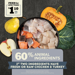 Deboned chicken, deboned turkey, turkey meal, chicken meal, whole red lentils, whole green peas, whole yellow peas, lentil fiber, atlantic flounder, chicken giblets, chicken broth, dried pumpkin, whole green lentils, whole pinto beans, whole chickpeas, herring meal, pollock oil, natural chicken flavor, whole dried egg, chicken cartilage, mixed tocopherols (preservative), whole pumpkin, collard greens, whole carrots, whole apples, dried kelp, zinc proteinate, calcium pantothenate, freeze-dried chicken liver, freeze-dried turkey liver, chicory root, turmeric, sarsaparilla root, althea root, rose hips, juniper berries, dried lactobacillus acidophilus fermentation product, dried bifidobacterium animalis fermentation product, dried lactobacillus casei fermentation product.