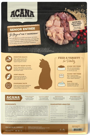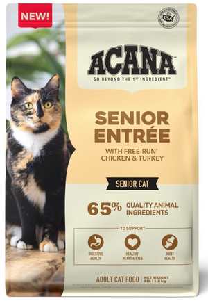 Help your furry bestie thrive as she gets older with ACANA Senior Entree Dry Cat Food for Senior Cats (7+ Years), Free Run Chicken and Turkey Recipe. Specially formulated for older cats 7 years and up, this grain-free recipe starts with free-run chicken and turkey for im-paws-ibly good taste and nutrition. Made with up to 65% animal ingredients and 35% fruits, vegetables and botanicals, the high-protein formula includes fiber and probiotics to support good digestive health. Naturally occurring omega-3 & omega-6 fatty acids support joint health, healthy skin and a shiny coat, while taurine, EPA and DHA help maintain your senior kitty’s eye and heart health. With no artificial flavors, colors or preservatives and whisker-licking good flavor, it’s a purr-fect meal your sassy senior will love!