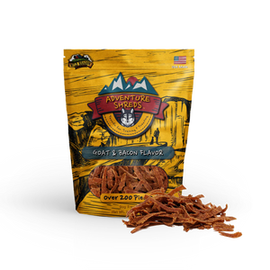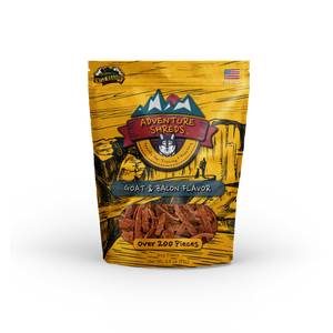 Our USA-made Goat Adventure Shreds combine the exciting taste of Goat and the enticing flavor of real bacon that every dog is sure to love. We craft the treats into a thin, ribbon shape that makes it easy to tear and portion. The bag is full with over 200 pieces or like we say "200 Reasons to Treat Your Dog." The shape and texture of these soft, flavorful treats make them ideal for those personal interactions with your dog, whether it's a training session or you want to treat them just because you love 'em.