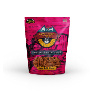 Our USA-made Pheasant Adventure Shreds combine the exciting taste of Pheasant and the enticing flavor of real bacon that every dog is sure to love. We craft the treats into a thin, ribbon shape that makes it easy to tear and portion. The bag is full with over 200 pieces or like we say "200 Reasons to Treat Your Dog." The shape and texture of these soft, flavorful treats make them ideal for those personal interactions with your dog, whether it's a training session or you want to treat them just because you love 'em.