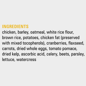 chicken, barley, oatmeal, white rice flour, brown rice, potatoes, chicken fat (preserved with mixed tocopherols), cranberries, flaxseed, carrots, dried whole eggs, tomato pomace, dried kelp, ascorbic acid, celery, beets