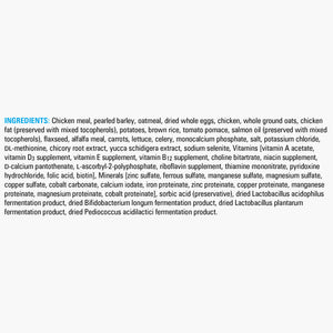 chicken meal, pearled barley, oatmeal, whole dried eggs, chicken, whole ground oats, chicken fat (preserved with mixed tocopherols), potato, brown rice, tomato pomace, salmon oil (preserved with mixed tocopherols), cheese, flaxseed, alfalfa meal, carrots, lettuce, celery, chicken cartilage, monocalcium phosphate, salt, potassium chloride, dl-methionine, chicory root extract, yucca schidigera extract, vitamins [vitamin A acetate, vitamin D3 supplement, vitamin E supplement, vitamin B12 supplement, choline bitartrate, niacin supplement, d-calcium pantothenate, l-ascorbyl-2-polyphosphate, riboflavin supplement, thiamine mononitrate, pyridoxine hydrochloride, folic acid, biotin], minerals [zinc sulfate, ferrous sulfate, manganous sulfate, magnesium sulfate, copper sulfate, cobalt carbonate, calcium iodate, sorbic acid (preservative), ferrous proteinate, zinc proteinate, copper proteinate, manganese proteinate, magnesium proteinate, cobalt proteinate], dried lactobacillus acidophilus fermentation product, dried bifidobacterium longum fermentation product, dried lactobacillus plantarum fermentation product, dried enterococcus faecium fermentation product