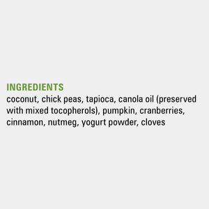 coconut, chick peas, tapioca, canola oil (preserved with mixed tocopherols), pumpkin, cranberries, cinnamon, nutmeg, yogurt powder, cloves