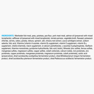ocean fish meal, peas, potatoes, pea flour, pork meat meal, salmon oil (preserved with mixed tocopherols), safflower oil (preserved with mixed tocopherols), tomato pomace, vegetable broth, flaxseed, potassium chloride, carrots, celery, parsley, lettuce, spinach, salt, chicory root extract, yucca schidigera extract, sodium selenite, folic acid, vitamins [vitamin A acetate, vitamin D3 supplement, vitamin E supplement, vitamin B12 supplement, choline bitartrate, niacin supplement, d-calcium pantothenate, L-Ascorbyl-2-polyphosphate, riboflavin supplement, thiamine mononitrate, pyridoxine hydrochloride, biotin], minerals [zinc sulfate, ferrous sulfate, manganous sulfate, magnesium sulfate, copper sulfate, cobalt carbonate, calcium iodate, sorbic acid (preservative), ferrous proteinate, zinc proteinate, copper proteinate, manganese proteinate, magnesium proteinate, cobalt proteinate], dried lactobacillus acidophilus fermentation product, dried bifidobacterium longum fermentation product, dried lactobacillus plantarum fermentation product, dried enterococcus faecium fermentation productGuaranteed Analysis