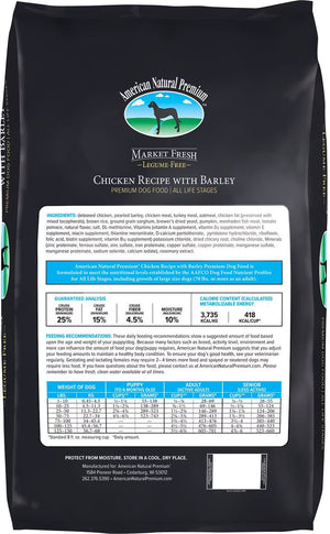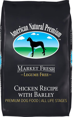 American Natural Premium Market Fresh Legume Free Chicken Recipe with Barley Dog Dry Food offers a safe, healthy and scrumptious option for your paw-tner. This scrumptious kibble features real, deboned chicken as the first ingredient. Wholesome grains like barley offer a rich source of vitamins, minerals and antioxidants, while oatmeal provides paw-lenty of fiber. Plus, added pumpkin, prebiotics and probiotics support healthy digestion and a strong immune system. This American Natural recipe is made in the USA and contains no legumes, corn, wheat, or soy and no artificial colors, flavors or preservatives. Formulated for all life stages.