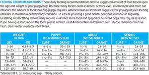 The following daily feeding recommendations show a suggested amount of food based upon the age and weight of your puppy/dog. Because many factors such as breed, activity level, environment and more can influence the amount of food your dog/puppy requires, American Natural Premium suggests that you adjust your feeding amounts to maintain a healthy body condition. To ensure your dog’s good health, see your veterinarian regularly. Gestating and lactating females may require 2-4 times more food and spayed or neutered dogs may require less food. If you have questions about the food, please contact us at americannaturalpremium.com. Please remember to have fresh, clean water available at all times.