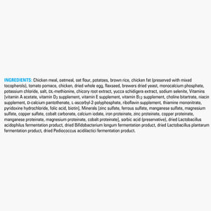 chicken meal, oatmeal, oat flour, potato, brown rice, chicken fat (preserved with mixed tocopherols), tomato pomace, chicken, whole dried egg, flaxseed, brewers dried yeast, monocalcium phosphate, potassium chloride, salt, dl-methionine, chicory root extract, yucca schidigera extract, vitamins [vitamin A acetate, vitamin D3 supplement, vitamin E supplement, vitamin B12 supplement, choline bitartrate, niacin supplement, d-calcium pantothenate, l-ascorbyl-2-polyphosphate, riboflavin supplement, thiamine mononitrate, pyridoxine hydrochloride, folic acid, biotin], minerals [zinc sulfate, ferrous sulfate, manganous sulfate, magnesium sulfate, copper sulfate, cobalt carbonate, calcium iodate, sorbic acid (preservative), ferrous proteinate, zinc proteinate, copper proteinate, manganese proteinate, magnesium proteinate, cobalt proteinate], dried lactobacillus acidophilus fermentation product, dried bifidobacterium longum fermentation product, dried lactobacillus plantarum fermentation product, dried enterococcus faecium fermentation product.Guaranteed Analysis