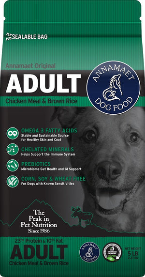 Designed for older dogs or dogs with slower metabolisms, Adult is also a popular formula with kennels. Annamaet Adult is made with antibiotic free, low ash chicken and brown rice. Like all Annamaet original formulas, it is corn, wheat, and soy free.