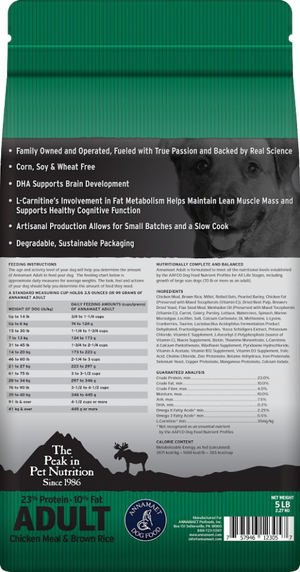 Designed for older dogs or dogs with slower metabolisms, Adult is also a popular formula with kennels. Annamaet Adult is made with antibiotic free, low ash chicken and brown rice. Like all Annamaet original formulas, it is corn, wheat, and soy free.