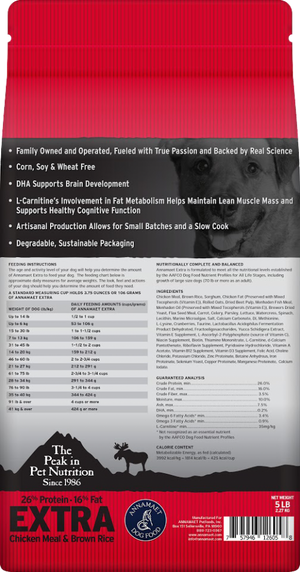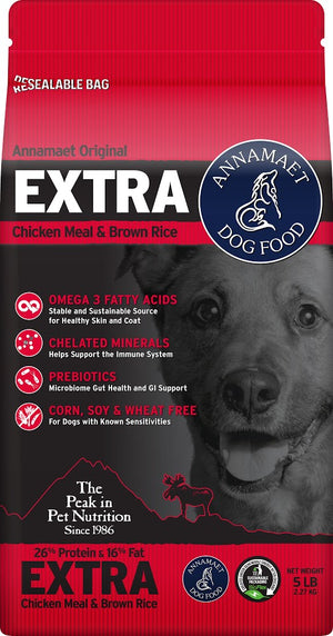 Annamaet Extra is formulated with a slightly higher fat content, making it more appealing to active dogs, canine athletes, working dogs and bully breeds. This formula is made with low ash chicken and brown rice. Annamaet Extra is formulated to meet all the nutritional levels established by the AAFCO Dog Food Nutrient Profiles for All Life Stages, including growth of large size dogs (70 lbs. or more as an adult).
