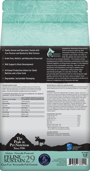 In dedication to green business practices and support of a more sustainable future, Feline Sustain No. 29 is formulated with two certified, sustainable sources of fish. A grain free, fresh meat formula; it contains added prebiotics and natural antioxidants from turmeric, blueberry, and cranberries.