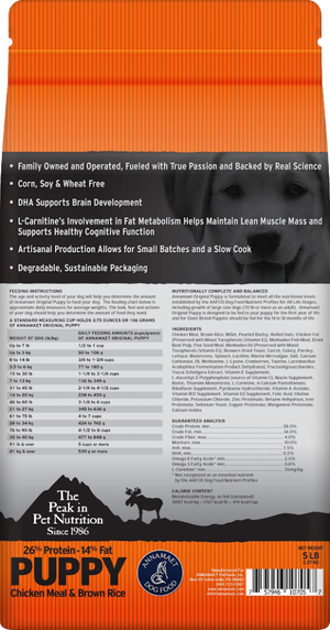 Annamaet Original Puppy will compliment our original line of products as it is formulated with chicken meal and brown rice. It is corn, soy, and wheat free and also fortified with a stable, sustainable source of DHA. This major Omega 3 Fatty Acid is long known to enhance brain development in puppies.