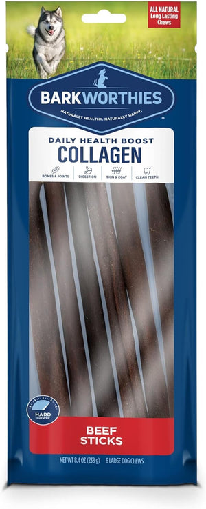 Barkworthies Daily Health Boost Collagen Beef Sticks are made up of 95% collagen, making them good for your dog, inside and out. Collagen helps support your dog's skin and coat, while promoting mobility and flexibility. These long-lasting chews will help keep your dog busy for hours. While providing them with the healthy nutrients that they need!