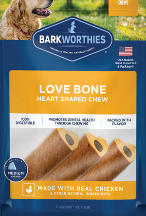 Barkworthies new Love Bone is a natural and long-lasting chew packed with goodness your dog and you will love! It’s made with real chicken and other all-natural ingredients. It’s unique heart shape is packed with protein to help their teeth sparkle and add a spring to their step. Always hand packed with love in Richmond, VA.