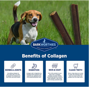 Barkworthies Collagen Chew treats are loaded with collagen that promote mobility, support healthy skin and coat and Boost Digestive health. These meaty treats are virtually odor free and their long lasting texture help remove tartar and plaque from your pup's teeth.