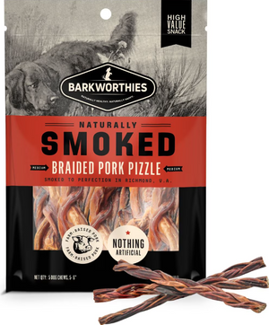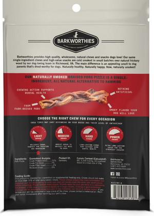Treat your pup to the best chew around with Barkworthies 6” Smoked Braided Pork Pizzle Dog Chews! These single-ingredient chews are made with real hickory-smoked pork pizzle for a drool-worthy flavor your furry friend won’t be able to resist. Hand-packed in Virginia, USA, these chews have an irresistible smoky smell that’ll have your little buddy begging for more. The unique shape and texture of this chew adds a fun challenge to his chewing routine, while also helping to grind down plaque and tartar. Plus, the 6” size is ideal for dogs of all sizes and ages.