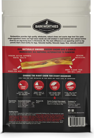 Introducing Barkworthies Smoked Cheeky 6” Beef Dog Chews! Your pup will love munching on this tasty snack. Each chew is lovingly smoked in Virginia with irresistible hickory, creating a drool-worthy chew inside and out. These long-lasting, single-ingredient chews are made with grass-fed beef and are completely digestible. As your buddy chews, the treats support dental health by scrubbing off plaque and tartar. Let your furry friend savor this tasty treat, and both of you can revel in that delightful aroma!