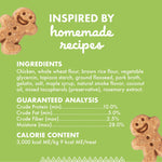 Chicken, Whole Wheat Flour, Brown Rice Flour, Vegetable Glycerin, Tapioca Starch, Ground Flaxseed, Pork Broth, Gelatin, Salt, Maple Syrup, Natural Smoke Flavor, Coconut Oil, Mixed Tocopherols (Preservative), Rosemary Extract.