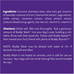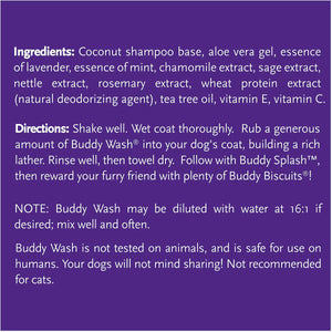 Shake well. Wet coat thoroughly. Rub a generous amount of Buddy Wash® into your dog's coat, building a rich lather. Rinse well, then towel dry. Follow with Buddy Rinse™ or Buddy Splash™, then reward your furry friends with plenty of Buddy Biscuits®!