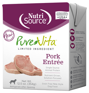 NutriSource PureVita Pate-Style dog food features meat rich, single source animal protein dense recipes. Wet dog foods are a good additional source of hydration for your pet.
