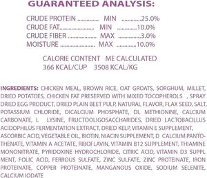Made in NY CHICKEN MEAL, BROWN RICE, OAT GROATS, SORGHUM, MILLET, DRIED POTATOES, CHICKEN FAT (PRESERVED WITH MIXED TOCOPHEROLS), SPRAY DRIED EGG PRODUCT, DRIED PLAIN BEET PULP, NATURAL FLAVOR, FLAX SEED, SALT, POTASSIUM CHLORIDE, DICALCIUM PHOSPHATE, DL METHIONINE, CALCIUM CARBONATE, L-LYSINE, FRUCTOOLIGOSACCHARIDES, DRIED LACTOBACILLUS ACIDOPHILUS FERMENTATION EXTRACT, DRIED KELP, VITAMIN E SUPPLEMENT, ASCORBIC ACID, VEGETABLE OIL, BIOTIN, NIACIN SUPPLEMENT, D-CALCIUM PANTOTHENATE, VITAMIN A ACETATE, RIBOFLAVIN, VITAMIN B12 SUPPLEMENT, THIAMINE MONONITRATE, PYRIDOXINE HYDROCHLORIDE, CITRIC ACID, VITAMIN D3 SUPPLEMENT, FOLIC ACID, FERROUS SULFATE, ZINC SULFATE, ZINC PROTEINATE, IRON PROTEINATE, COPPER PROTEINATE, MANGANOUS OXIDE, SODIUM SELENITE, CALCIUM IODATE