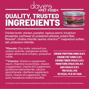 Dave went all in on texture and taste in this wholesome recipe. Made with real chicken and pumpkin in a chicken broth, with essential vitamins, minerals, and taurine for a complete a beautifully balanced, grain-free meal. Contains no GMOs, wheat, wheat gluten, artificial flavors or coloring.