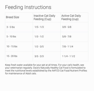 DAVE’S NATURALLY HEALTHY CAT FOOD IS FORMULATED TO MEET THE NUTRITIONAL LEVELS ESTABLISHED BY THE AAFCO CAT NUTRIENT PROFILES FOR THE MAINTENANCE OF ADULT CATS.