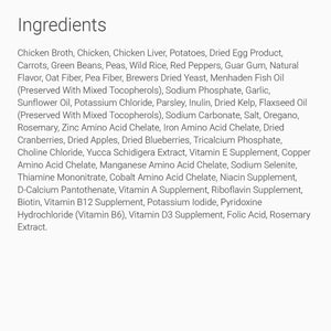 Chicken Broth, Chicken, Chicken Liver, Potatoes, Dried Egg Product, Carrots, Green Beans, Peas, Wild Rice, Red Peppers, Guar Gum, Natural Flavor, Oat Fiber, Pea Fiber, Brewers Dried Yeast, Menhaden Fish Oil (Preserved with Mixed Tocopherols), Sodium Phosphate, Garlic, Sunflower Oil, Potassium Chloride, Parsley, Inulin, Dried Kelp, Flaxseed Oil (Preserved with Mixed Tocopherols), Sodium Carbonate, Salt, Oregano, Rosemary, Zinc Amino Acid Chelate, Iron Amino Acid Chelate, Dried Cranberries, Dried Apples, Dried Blueberries, Tricalcium Phosphate, Choline Chloride, Yucca Schidigera Extract, Vitamin E Supplement, Copper Amino Acid Chelate, Manganese Amino Acid Chelate, Sodium Selenite, Thiamine Mononitrate, Cobalt Amino Acid Chelate, Niacin Supplement, D-Calcium Pantothenate, Vitamin A Supplement, Riboflavin Supplement, Biotin, Vitamin B12 Supplement, Potassium Iodide, Pyridoxine Hydrochloride (Vitamin B6), Vitamin D3 Supplement, Folic Acid, Rosemary Extract.
