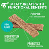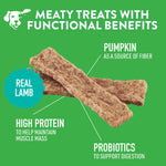 Lamb, Pumpkin, Vegetable Glycerin, Salt, Beef Broth, Vinegar, Ginger, Dried Bacillus, Subtilis Fermentation Product, Dried Lactobacillus, Plantarum Fermentation Product, Dried Enterococcus, Faecium Fermentation Product, Dried Lactobacillus, Acidophilus Fermentation Product, Dried Lactobacillus, Reuteri Fermentation Product, Dried Bifidobacterium, Animalis Fermentation Product.