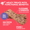 Duck, Chicken, Dried Egg, Vegetable Glycerin, Salt, Dried Cultured Skim Milk, Glucosamine Hydrochloride, Zinc Propionate, Chondroitin Sulfate, Mixed Tocopherols (preservative), New Zealand Green Mussel, Vitamin E Supplement, Rosemary Extract.