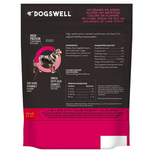 Reward your small dog with the chunky, meaty flavor he craves with a little something extra inside. The Immune System mini jerky treats from Dogswell are made with real duck, for a treat that satisfies more than just his taste buds. That's because each flavorful bite helps to maintain his lean muscle mass with 60 percent high-quality protein. How's that for a pick-me-up? with an additional antioxidant boost from vitamins A and E, these tasty jerky treats may even promote a healthy immune system, too! So, while he's chomping on authentic, USA-made jerky, you can bask in the knowledge that his new favorite chew is a healthy, grain-free snack you trust. It's everything your dog has ever wanted, with everything you expect from a pet-loving company like Dogswell.