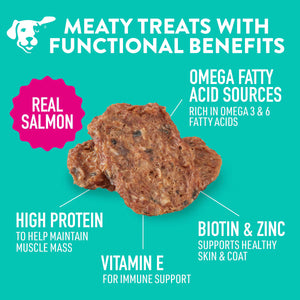 Reward your small dog with the chunky, meaty flavor he craves with a little something extra inside. The Skin & Coat mini jerky treats from Dogswell are made with real salmon, for a treat that satisfies more than just his taste buds. That's because each flavorful bite helps to maintain his lean muscle mass with 48 percent high-quality protein. How's that for a pick-me-up? with an additional boost from omega-3 and omega-6 fatty acids, these scrumptious treats may even promote healthy skin and a lustrous coat, too! So, while he's chomping on authentic, USA-made jerky, you can bask in the knowledge that his new favorite chew is a healthy, grain-free snack you trust. It's everything your dog has ever wanted, with everything you expect from a pet-loving company like Dogswell.