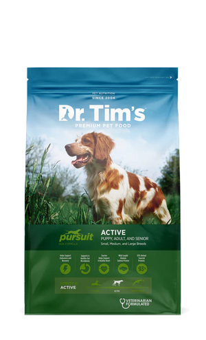 Dr. Tim's Pursuit Formula Dog Food is specially suited for most life stages, especially adult and senior dogs who are active and athletic. This formula combines high levels of omega-3 fatty acids and protein from 85% animal sources to create a formula that delivers efficient nutritional sources to ensure optimal recovery and energy levels.