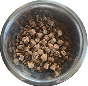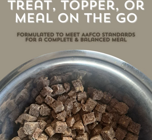 Dr. Tim’s Vagabond Elk Bites Freeze-Dried Dog Treats are a tasty triple threat! You can use these hybrid bites as mix-ins, treats, or lightweight portable meals on the go. Simply mix these delectable bites with kibble, give them as a treat, or rehydrate them for a complete and balanced meal. Paw-fect for rewarding your best pal’s behavior when you’re on the go or as a raw addition to your dog’s kibble.
