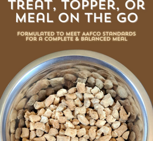 Dr. Tim’s Vagabond Pork Bites Freeze-Dried Dog Treats are a tasty triple threat! You can use these hybrid bites as mix-ins, treats, or lightweight portable meals on the go. Simply mix these delectable bites with kibble, give them as a treat, or rehydrate them for a complete and balanced meal. Paw-fect for rewarding your best pal’s behavior when you’re on the go or as a raw addition to your dog’s kibble.