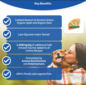 Give your beloved furry companion the best nutrition with Farmina N&D Ancestral Grain Canine Adult GMO-Free Chicken Spelt Oats Pomegranate Maxi Giant Dry Dog Food. This complete maintenance diet is perfect for pups of all ages and breeds. It’s inspired by the ancestral cereals of Italy—spelt and oats. Each recipe is carefully crafted with locally sourced ingredients from trusted partners, ensuring your furbaby receives all the essential nutrients for optimal health and well-being. With a limited amount of ancient grains, a low glycemic index, and 90% protein from animal sources, this formula is customized to meet your pup’s unique dietary needs. Plus, it’s free from potatoes and legumes and includes 1,000 mg/kg of cold-infused taurine for added integration. It’s a dry dog food that you can feel good about feeding to your four-legged family member.