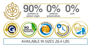 Natural & Delicious Low Ancestral Grain contains limited ancestral cereals (spelt and oats) and is comprised of 60% high-quality animal ingredients, 20% organic spelt and organic oats, and 20% vegetables, fruits, vitamins, and minerals.