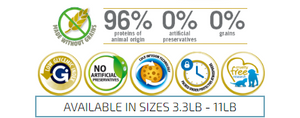 cod, dehydrated cod, sweet potatoes, herring oil, dehydrated shrimp, dried pumpkin, dehydrated herring, dried carrot, suncured alfalfa meal, inulin, fructooligosaccharide, yeast extract, dried cantaloupe melon, dried pomegranate, dried spinach, psyllium seed husk, dried blueberry, dried apple, salt, potassium chloride, brewers dried yeast, turmeric, vitamin A supplement, vitamin D3 supplement, vitamin E supplement, ascorbic acid, niacin, calcium pantothenate, riboflavin, pyridoxine hydrochloride, thiamine hydrochloride, biotin, folic acid, vitamin B12 supplement, choline chloride, beta-carotene, zinc methionine hydroxy analogue chelate, manganese methionine hydroxy analogue chelate, ferrous glycine, copper methionine hydroxy analogue chelate, DL-Methionine, taurine, aloe vera gel concentrate, green tea extract, rosemary extract, mixed tocopherols (a preservative).
