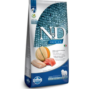 Give your furry friend the best of the sea with Farmina N&D Ocean Canine Adult GMO-Free Salmon Cod Cantaloupe Maxi Giant Dry Dog Food. This specially formulated recipe is suitable for pups of all ages and breeds, with up to 98% of animal proteins sourced from the ocean. Each recipe is carefully crafted to satisfy even the fussiest of furbabies. N&D Ocean uses only the finest ingredients to create grain-free or low ancestral grain recipes. Loaded with omega-3 fatty acids, this diet supports the overall health and vitality of your pup. Plus, with a blend of wholesome ingredients sourced from trusted partners, you can trust this kibble to meet your four-legged family member’s unique dietary needs. Give your pup the taste of the sea.