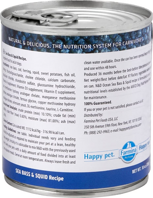 Your pup will be wagging his tail over the buffet of oceanic delights in Farmina Natural & Delicious Ocean Seabass & Squid Canned Dog Food! This recipe is packed with seabass, cod, squid, sweet potatoes and more with absolutely zero fillers. Each portion is individually cooked in the can from raw ingredients for optimal nutrient extraction and contains no fillers like legumes, thickeners, added water or broth. Enhanced with vitamins and minerals your best buddy needs to thrive, each BPA-free can contains a complete and balanced diet with delicious flavor and optimal nutrition you can trust.