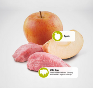 Wild Boar, Herring, Sweet Potatoes, Eggs, Herring Oil, Apples, Fructooligosaccharide, Chondroitin Sulfate, Glucosamine Hydrochloride, Vitamin A Supplement, Vitamin D3 Supplement, Vitamin E Supplement, Choline Chloride, Zinc Methionine Hydroxy Analogue Chelate, Manganese Methionine Hydroxy Analogue Chelate, Ferrous Glycine Complex, Copper Methionine Hydroxy Analogue Chelate, Selenium Yeast, DL-Methionine, Taurine, L-Carnitine.