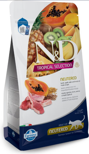 Treat your kitty to the tropical taste and paw-some nutrition of Farmina N&D Tropical Selection Lamb Neutered Dry Cat Food. This complete and balanced diet is specially formulated for neutered adult cats. The thoughtful recipe boasts a minimum of 92% protein content derived from animal sources, including real lamb as the first ingredient. It also incorporates five tropical fruits, including papaya, mango, kiwi, pineapple, and banana, to please even the most discerning palates. N&D Tropical Selection provides optimal nutrition for your cherished feline companion.