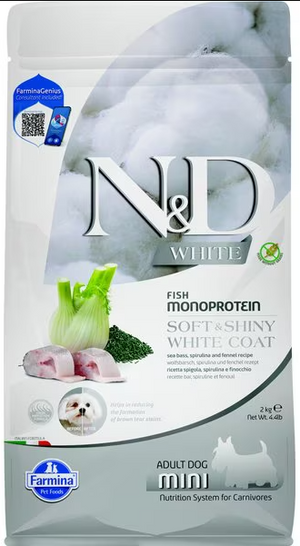 Pet parents, give your furry friend the gift of a healthy coat with Farmina N&D White Coat Canine Formula Adult GMO-Free Sea Bass, Fennel & Kelp Mini Dry Dog Food. This complete and nutrient-balanced food is specially formulated to support the overall health and appearance of your pup. With its exclusive Color Protection Formula, this mono-protein recipe helps to reduce the risk of staining on white coats. It also contains a high amount of hydrolyzed proteins and a moderate protein content, which can help prevent adverse food reactions that may cause inflammation and lead to excessive tearing or skin irritation. Say goodbye to damaged hair and hello to a healthy, shiny, and stain-free coat with Farmina N&D White.