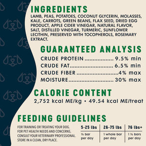 - Each bag contains soft and chewy dog treat bars made with nutrient-dense superfoods like lamb, kale, carrots, and flaxseeds